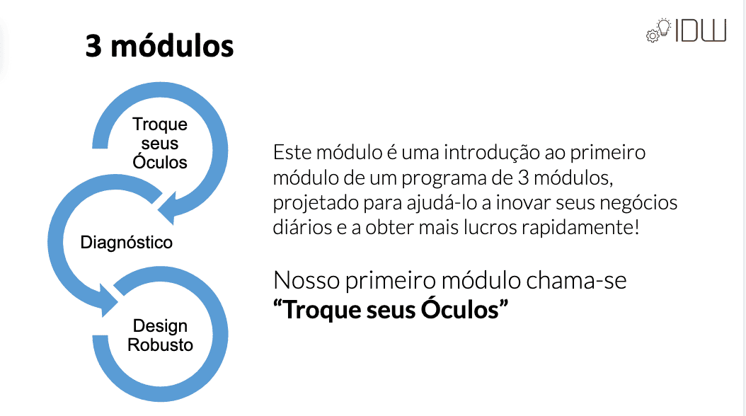 Este Módulo é o primeiro de 3 no Método completo IDW™ (Innovate your Daily Work), projetado para ajudá-lo a inovar seu trabalho diário para a Melhoria Acelerada do Desempenho.